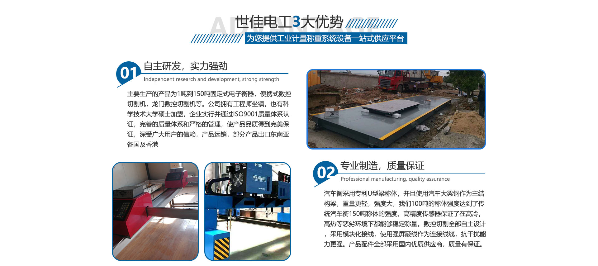 合肥世佳電工設(shè)備有限公司是生產(chǎn)、銷(xiāo)售工業(yè)自動(dòng)化設(shè)備。主要生產(chǎn)的產(chǎn)品為1噸到150噸固定式電子衡器,便攜式數(shù)控切割機(jī),龍門(mén)數(shù)控切割機(jī)等。公司擁有工程師坐鎮(zhèn),也有中國(guó)科學(xué)技術(shù)大學(xué)碩士加盟,完善的質(zhì)量體系和嚴(yán)格的管理,使產(chǎn)品品質(zhì)得到保證,深受廣大用戶(hù)的信賴(lài),產(chǎn)品各地可售,部分產(chǎn)品出口東南亞各國(guó)及香港,數(shù)控切割設(shè)備也在安徽處于前列。我們并不滿(mǎn)足現(xiàn)在所取得的成就,公司繼續(xù)加大科研投入,正在和中科大物理研究所科研人員共同研究開(kāi)發(fā)下一代衡器控制儀表,希望以技術(shù)作為突破口,將公司做大做強(qiáng),為中華崛起盡自己一份綿薄之力。歡迎廣大客戶(hù)來(lái)廠(chǎng)參觀(guān)訂貨考察。
